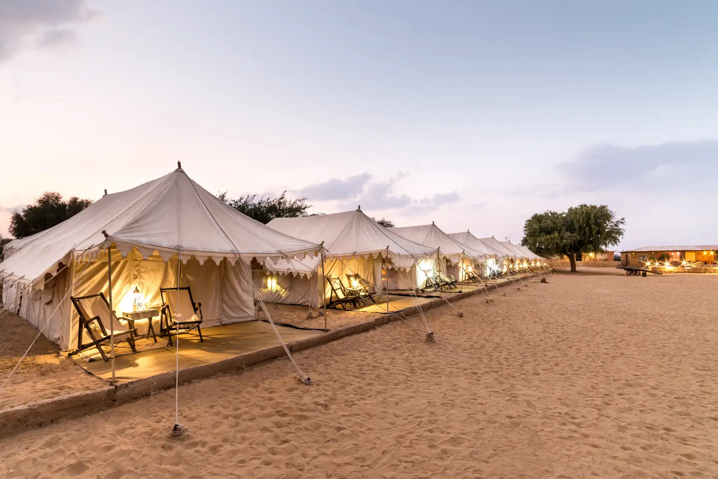Karma Golden Camp sits on 3.5 acres of open space in the Thar Desert and includes an amphitheatre, private dining canopies and a star gazing deck. The All-Day-Dining Restaurant – ‘Khejri’ serves desert-inspired Rajasthani cuisine made from locally sourced ingredients and using traditional cooking methods. The Three Monkeys Club at the Recreation Tent features activities and games like carrom, Jenga, darts, pottery, glass painting, puppet making and more. Every evening, guests can enjoy performances by local folk artists showcasing traditional dance and music – from kalbeliya dancing to classical Sufi and Marwari songs. Camel rides and dune bashing are popular activities near the resort. The accommodation at Karma Golden Camp adds an extra measure of charm to an already special experience.
